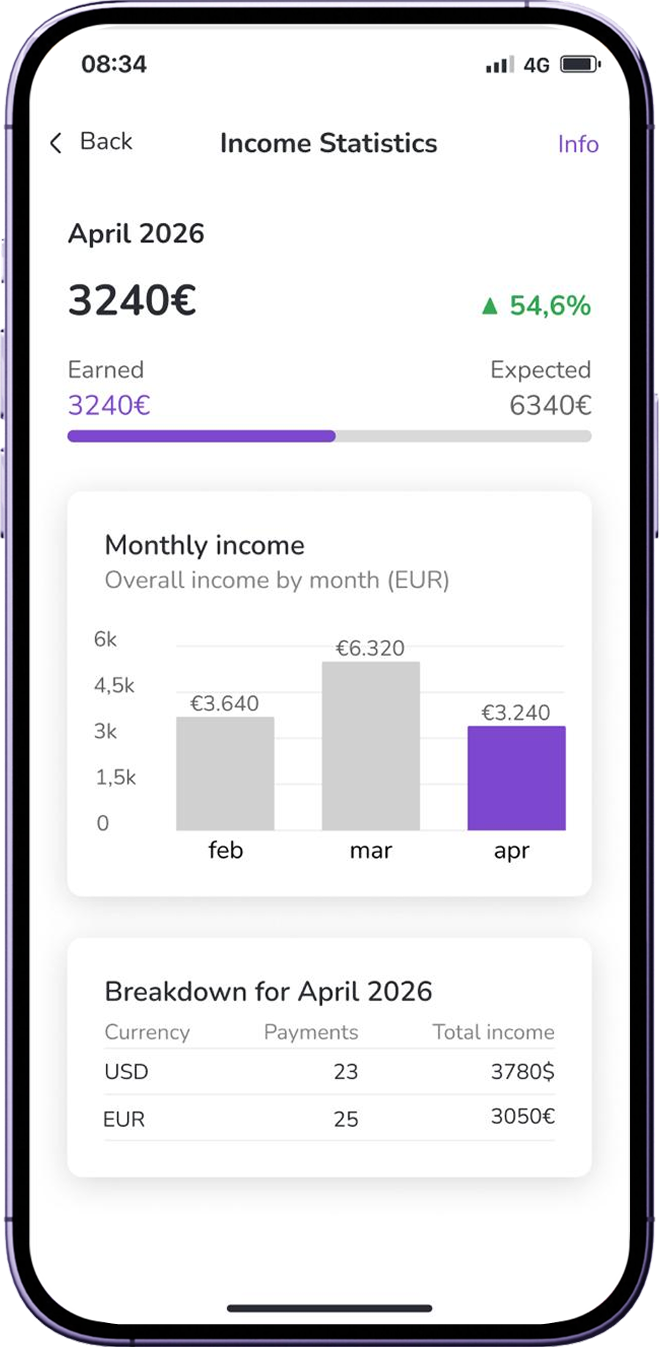 Track payments and outstanding balances without spreadsheets. Analytics shows your income and profit trends.