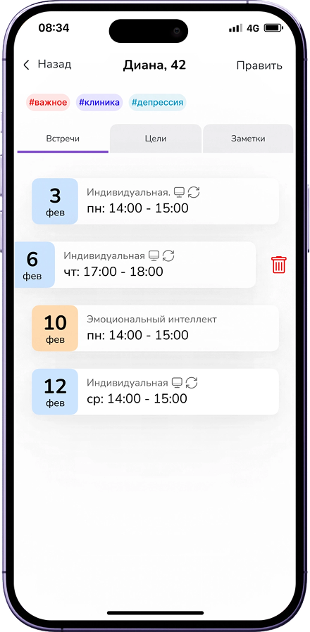 Все клиенты и сессии в удобном календаре. Планируйте расписание, фиксируйте формат и стоимость каждой встречи.